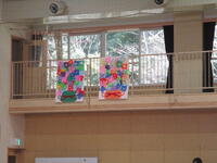 体育館のギャラリーには、6年生が考えた卒業に向けたスローガンや1,2年生が作ってくれた花かごを掲示しています。